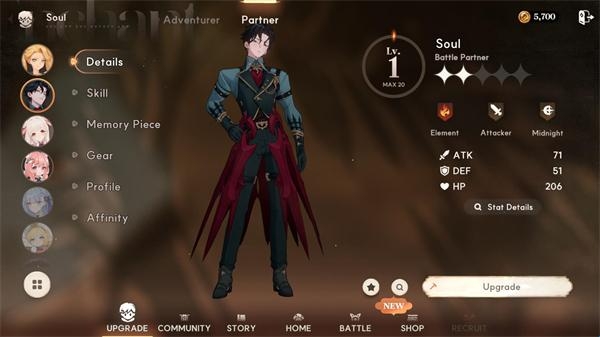 8、在下方菜单中点击“Upgrade”,再进入“Partner”界面,可以为伙伴进行升级,提升整体战斗力。